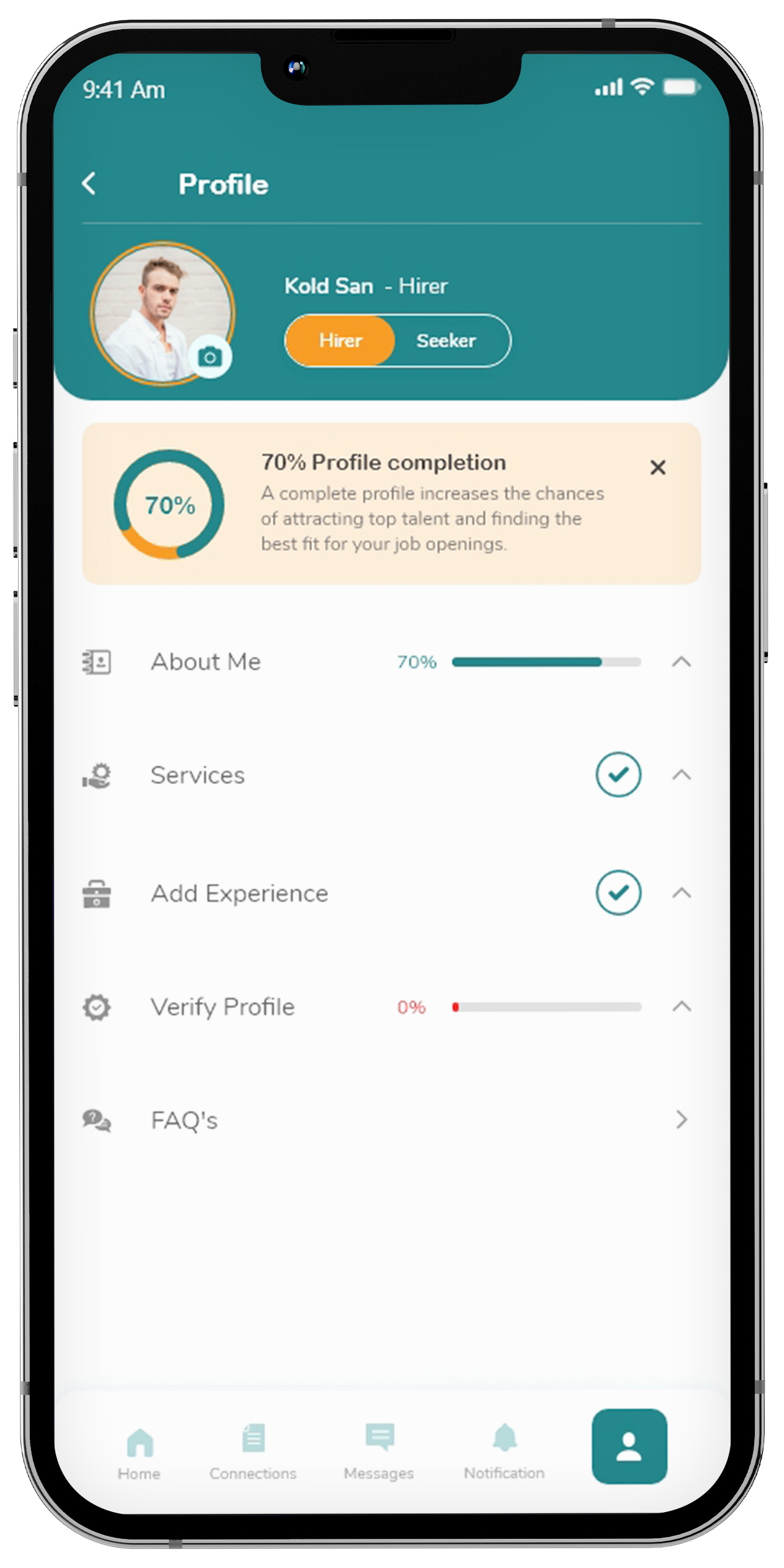 Once users have created their profile, they may begin seeking/providing work. Upseeks utilizes its powerful algorithm to connect the perfect candidate with the advertised job role. If the connection between the job seeker and provider is mutual, a discussion regarding the opportunity begins.